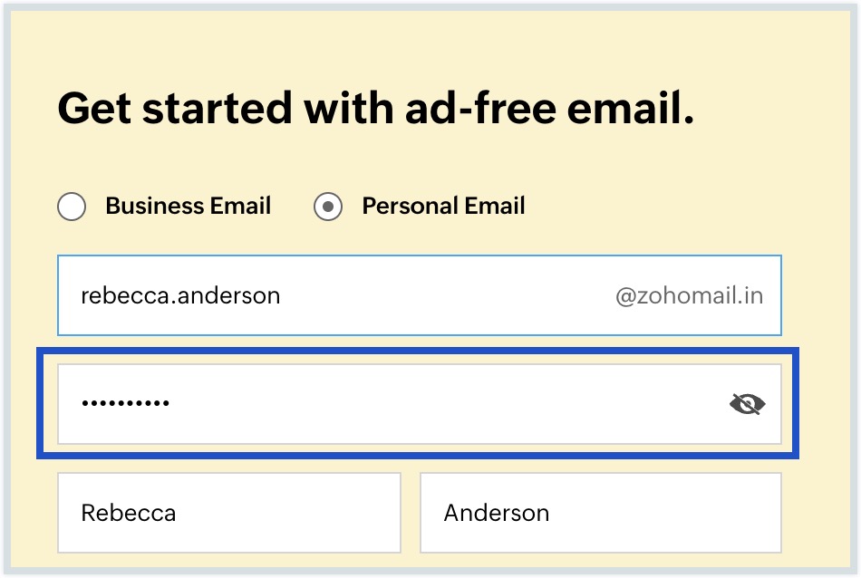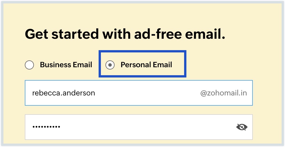 Go to the Zoho Mail website and click on “Personal email” if you want a personal account.